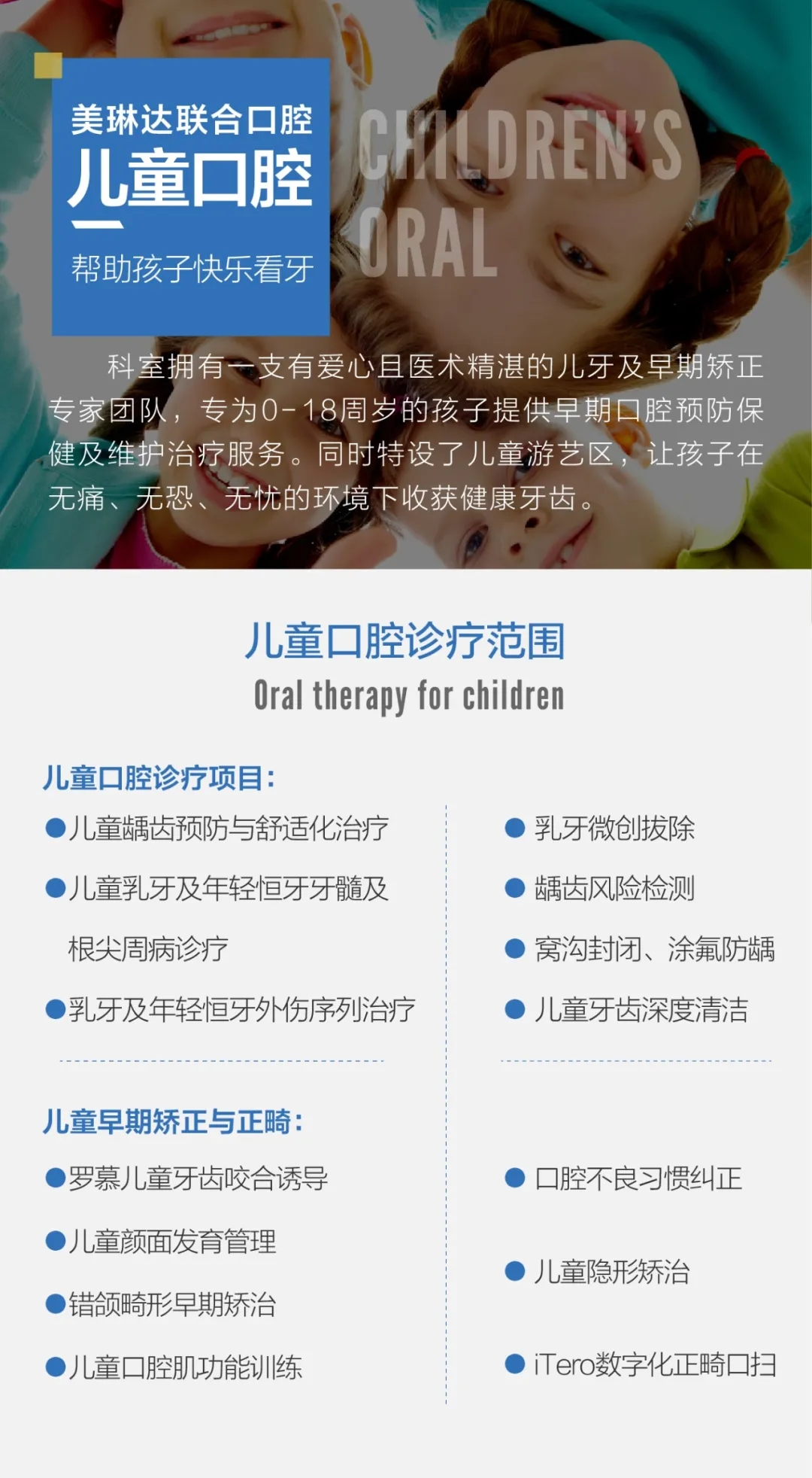2019年12月,医院集团及医院管理层经过为期半年的市场调研和反复的决策与商议,最终决定依托于儿科诊疗服务的基础,延伸儿童诊疗服务,联合众多权威口腔医生,建立专注儿牙的美琳达联合口腔,让孩子在快乐中看牙。