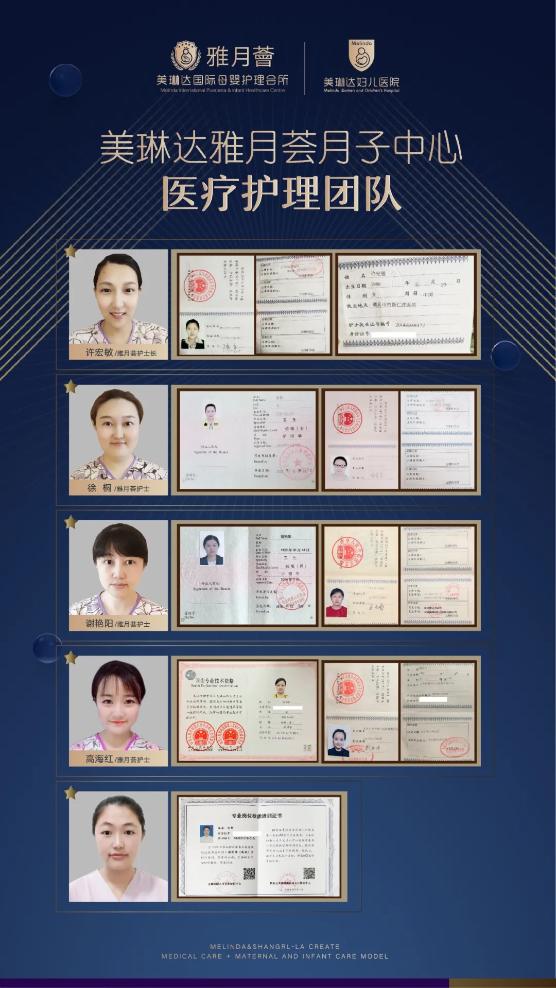 在美琳达雅月荟坐月子不仅有月嫂相伴,还有资深护士24小时陪护。与其他月子会所兼职护士不同,雅月荟护理团队全部来自美琳达妇儿医院护士,均持有护士资格证。由母婴护理经验丰富的护士长许宏敏领衔,24小时提供1V1照护,能够及时有效的解决产妇和宝宝的常见问题。