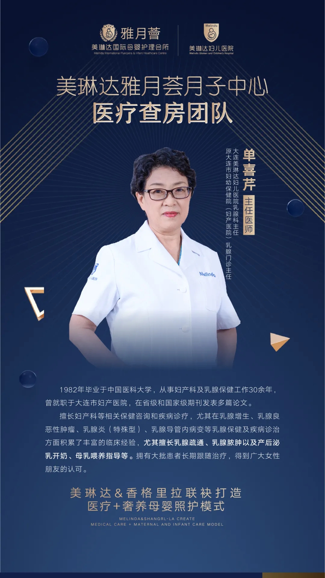 不同于传统月子会所护士查房,美琳达设置产儿乳腺医生多对一每周三次查房巡诊。汇集原沈阳公立三甲医院妇产科医生彭学兰、原大连市儿童医院新生儿科主任尹晶文、原大连市妇幼保健院(妇产医院)乳腺门诊主任单喜芹,人均30多年以上临床诊治经验,技术精湛,能够为母婴提供更专业的服务。